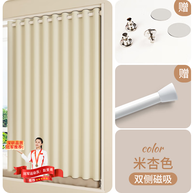 舒帘卧室遮光窗帘免打孔安装2025新款米拉绒飘窗小窗户遮阳布整套带杆 米杏色【加厚】双侧磁吸 80cm*150cm 【宽*高】一套带杆