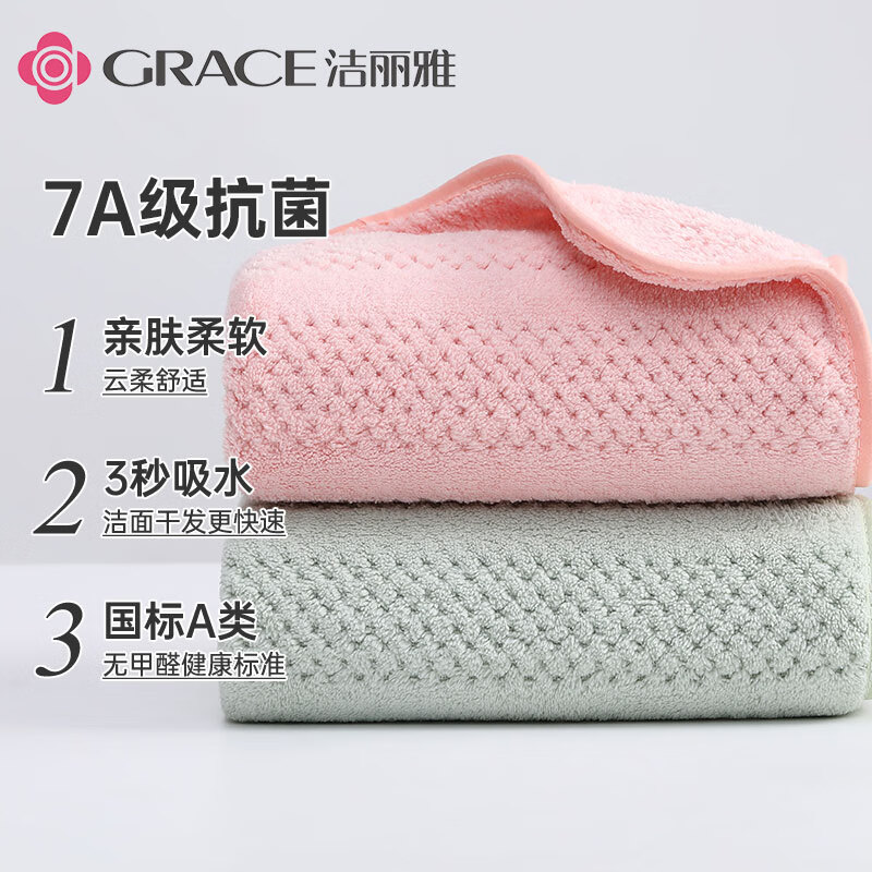洁丽雅毛巾 7A抗菌 A类加厚吸水男女洗脸干发大面巾 粉+绿 两条装